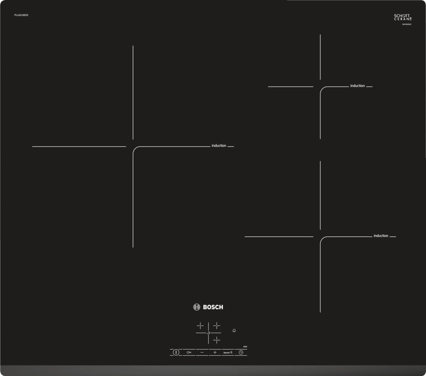 Bếp Từ Bosch PUJ631BB2E có bảng điều khiển TouchSelect dạng phím cộng trừ giúp điều chỉnh tăng giảm nhiệt dễ dàng tiện lợi.Mặt kính của bếp được thiết kế màu đen sang trọng SCHOTT CERAN sản xuất tại Mainz - có khả năng chịu lực, chịu nhiệt và khả năng va đập tốt, chống lại những cú sốc nhiệt đột ngột lên đến 750°C