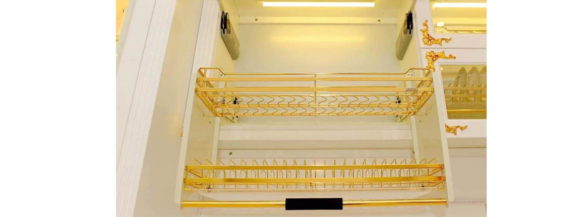 a, Giá bát thông minh hay còn gọi là giá bát nâng ha. Giống như các dàn chén bát thông thường Phụ kiện này cũng có 2 rổ inox, 1 để chén và 1 để dĩa kèm theo đó là khay chứa nước tích hợp gắn vào hông của phụ kiện giúp tủ gỗ không bị thấm nước và độ bền của tủ được gia tăng.