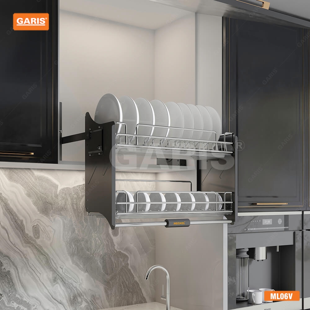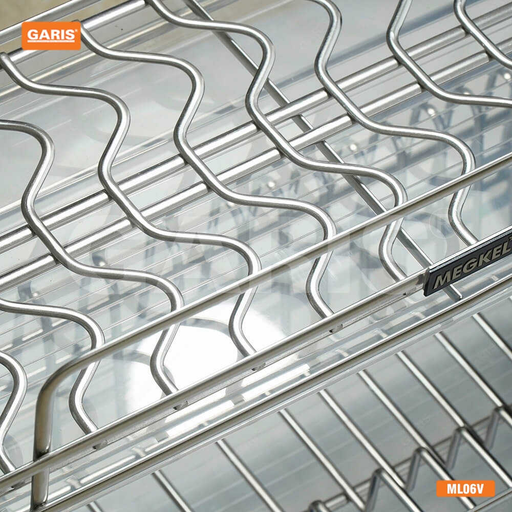 - "Giá bát nâng hạ Garis" được thiết kế 2 tầng thông thoáng, rộng rãi giúp bạn thoải mái úp nhiều bát đĩa. Tầng trên là ngăn để bát được chế tạo bởi chất liệu Inox 304 bóng gương, đảm bảo tốt sự ổn định khi nâng hạ. Ngay tầng dưới là ngăn để đĩa, không chỉ đẹp mắt mà còn giúp thuận tiện trong việc úp nghiêng, giúp cho bộ đĩa nhà bạn luôn khô ráo.