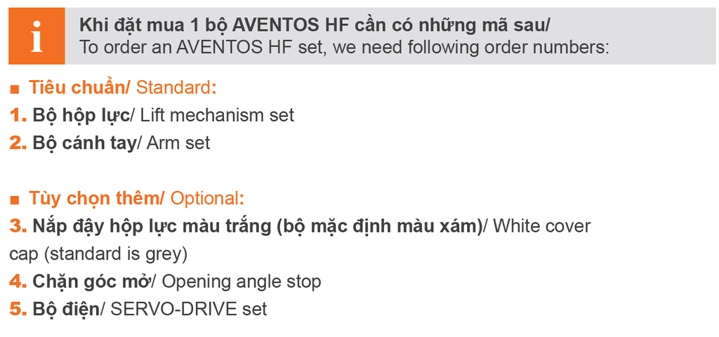 Muốn sử dụng Bộ tay nâng điện Blum cần mua thêm Bộ điện Servo-Drive cho Aventos HF và 01 Bộ điện cơ bản cho toàn bộ hệ thống điện nhà bếp