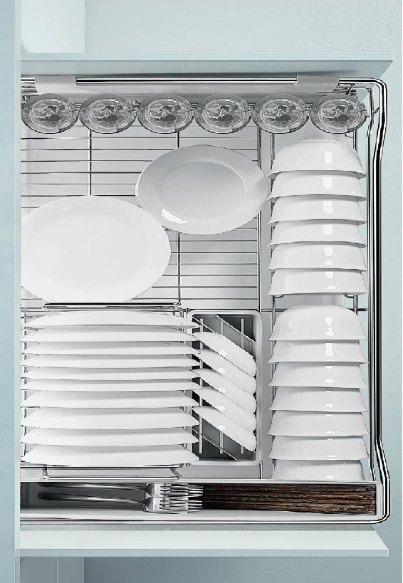 Được sắp xếp cách đều nhau đảm bảo ngăn tủ luôn khô thoáng, ráo nước. Xoong nồi, bát đĩa rửa xong không cần đợi có thể úp vào luôn mà không lo nước đọng làm ẩm tủ.